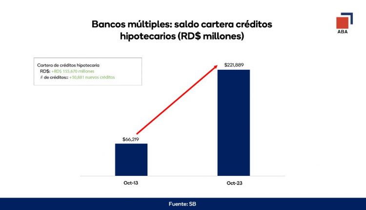 La Asociación de Bancos Múltiples de la República Dominicana (ABA) destacó el aporte del sector bancario durante la última década para reducir el déficit habitacional y facilitar el acceso a viviendas dignas a la ciudadanía, impulsado por la Ley 189-11 para el Desarrollo del Mercado Hipotecario y de Fideicomiso; lo que ha conllevado que los financiamientos otorgados para adquirir y remodelar hogares pasaran de 34,711 en octubre de 2013 a 85,592 en octubre de 2023.