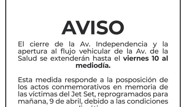 La medida se produce debido a la posposición este miércoles de los actos conmemorativos del primer aniversario de la tragedia de la discoteca Jet Set, debido a las intensas lluvias que afectaron al Distrito Nacional desde horas de la madrugada.