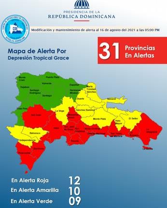 En alerta roja están las provincias La Altagracia, La Romana, San Cristóbal, Santo Domingo, Barahona, San Pedro de Macorís, San José de Ocoa, San Juan, Monseñor Nouel, Azua, Pedernales y Peravia.