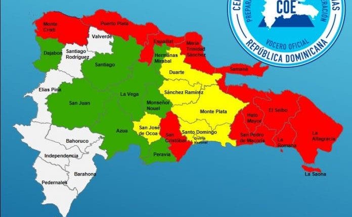 En alerta roja están las provincias La Altagracia, Samaná, San Pedro de Macorís, Hato Mayor, El Seibo, Puerto Plata, Montecristi, Espaillat, María Trinidad Sánchez, San Cristóbal y La Romana.