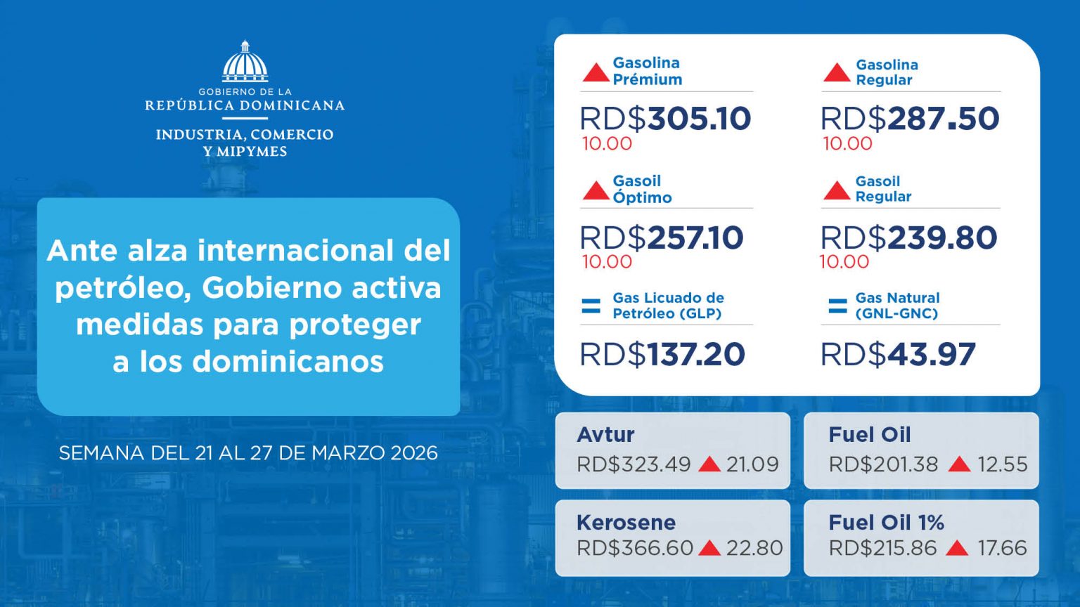 DISTRITO NACIONAL (República Dominicana).-. Frente a la inestabilidad del mercado petrolero global a raíz del conflicto armado en Medio Oriente, el Ministerio de Industria, Comercio y Mipymes (MICM) anunció hoy un conjunto de medidas orientadas a proteger la economía de las familias dominicanas y asegurar la sostenibilidad de las finanzas públicas. Esta decisión gubernamental responde a una crisis mundial sin precedentes: de acuerdo con la Agencia Internacional de Energía, la actual coyuntura bélica está provocando la mayor interrupción de suministro en la historia petrolera mundial, lo que ha elevado el precio del barril WTI en un 70 % en lo que va de 2026.