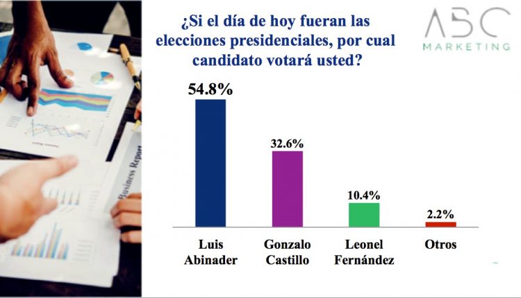 DISTRITO NACIONAL, República Dominicana.- El candidato presidencial del Partido Revolucionario Moderno (PRM) y sus fuerzas aliadas, Luis Abinader, es el favorito de los electores para resultar victorioso en primera vuelta en las elecciones del próximo 5 de julio, según los resultados de la encuesta ABC Marketing realizada en esta semana, la cual señala que acumula el 54.8% de la intención de votos, contra el 32.9% de Gonzalo Castillo, del Partido de la Liberación Dominicana (PLD) y el 10.4% de Leonel Fernández, de la Fuerza del Pueblo.