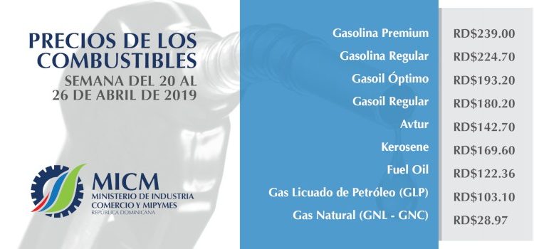 DISTRITO NACIONAL, República Dominicana. Todos los combustibles quedarán al mismo precio durante la semana del 20 al 26 de abril de 2019 por disposición del Ministerio de Industria, Comercio y Mipymes.