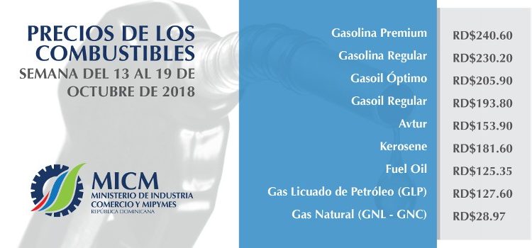 DISTRITO NACIONAL, República Dominicana.- Por tercera semana consecutiva, todos los combustibles continuarán con sus precios congelados para la venta al público del 13 al 19 de octubre de 2018, por resolución del Ministerio de Industria, Comercio y Mipymes.