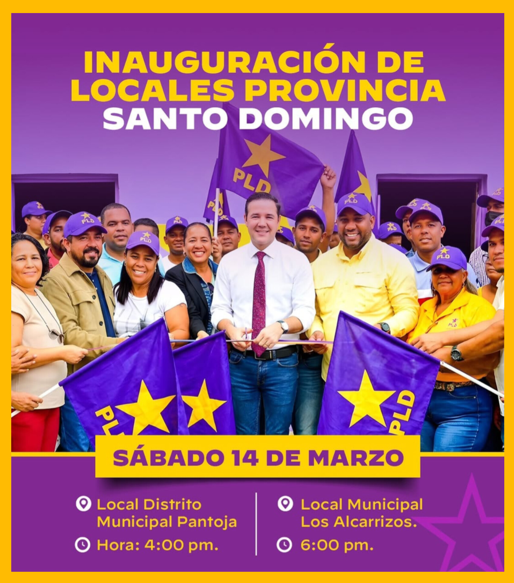 DISTRITO NACIONAL (República Dominicana).-. El Partido de la Liberación Dominicana (PLD), programó para este sábado actos inaugurales de locales de esa organización en el municipio Los Alcarrizos y en el distrito municipal, Pantoja, ambos de la provincia Santo Domingo.