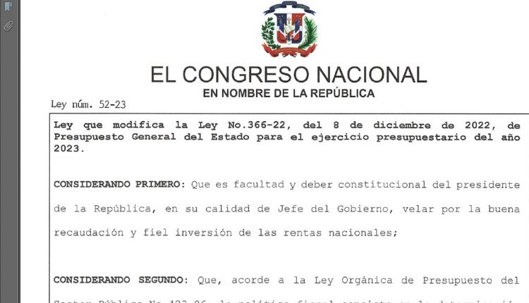 El presidente Luis Abinader promulgó en la tarde de este miércoles la Ley 52-23, que modifica la Ley 366-22, de Presupuesto General del Estado para el ejercicio presupuestario del año 2023.