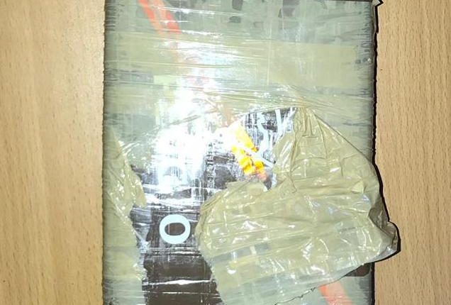 La presunta cocaína estaba envuelta con cinta adhesiva transparente y una goma de color negro.