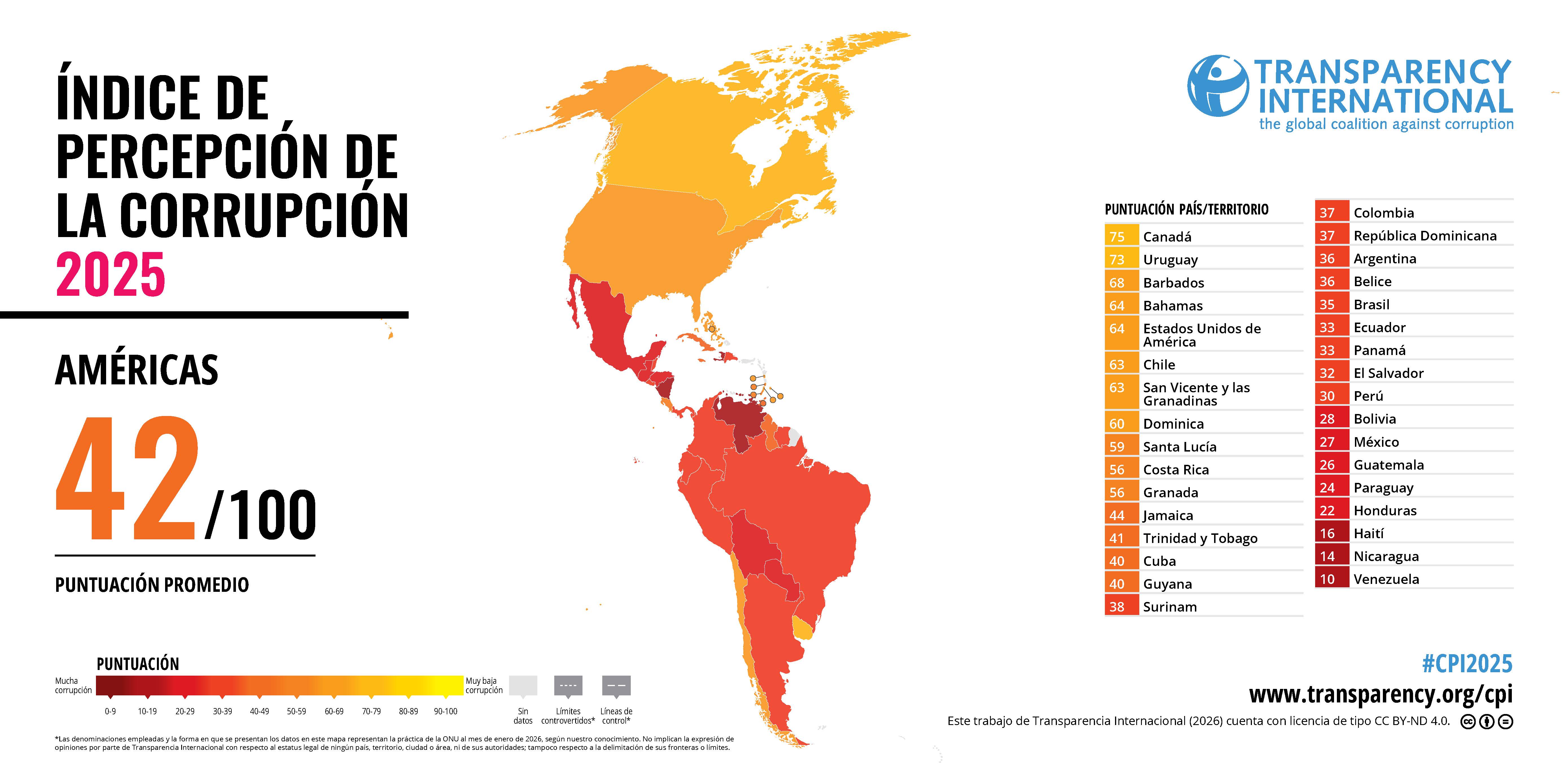 En el índice de Transparencia Internacional se afirma que, durante años, la corrupción ha permitido que el crimen organizado transnacional se infiltre en la política de países como México (lugar lugar 27), Brasil (lugar 35) y Colombia (lugar 37), fomentando la impunidad y las injusticias.