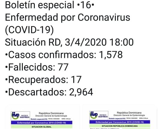 DISTRITO NACIONAL, República Dominicana.- La cantidad de víctimas ha ascendido a 77 personas por causa del coronavirus, según ha informado el vocero del Gobierno en su cuenta de Twitter.